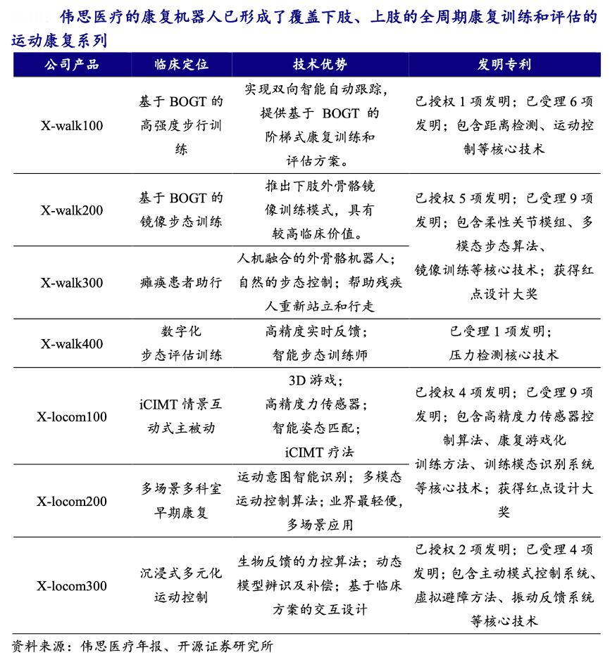 經典案例:根據偉思醫療年報、開源證券研究所等綜合資訊表明,偉思醫療的康復機器人產品線從 2021 年開始啟動正式上市,目前已經形成了 覆蓋下肢、上肢的全周期康復訓練和評估的運動康復系列機器人產品,包括 X-walk 系列和 X-locom 兩個產品系列。康復機器人應用于康復科、康復專科醫院、骨科、神經科等,協助截癱患、偏癱患者恢復步行能力,協助術后或者其它運動功能障礙患者進行康復訓練。