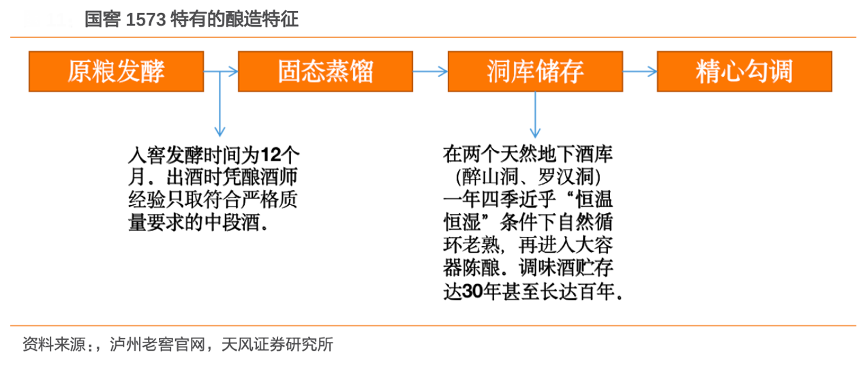 經(jīng)典案例:根據(jù)瀘州老窖官網(wǎng)、天風(fēng)證券研究所等綜合資訊表明,1573國寶窖池的連續(xù)使用年齡至今已超400年,國窖1573中能夠定量的香味成分為163種,而只能定性卻無法定量的成分還有 200 多種。國窖 1573 的主要釀造過程為原糧發(fā)酵、固態(tài)蒸餾、洞庫貯存和精心勾調(diào),一個(gè)完整的釀造過程耗時(shí)長達(dá) 30 年以上。