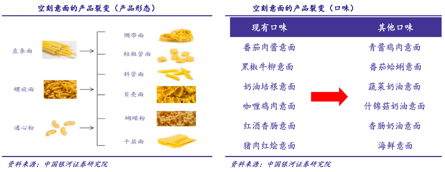 經典案例:根據中國銀河證券研究院等綜合資訊表明,空刻產品持續推進裂變:一方面進行口味創新,意面作為主食具備較好的口味延展性,目前公司產品主要以番茄肉醬口味為主;另一方面,意面具備多種形態,蝴蝶面、粗管面等等為產品創新提供了豐富的基底。