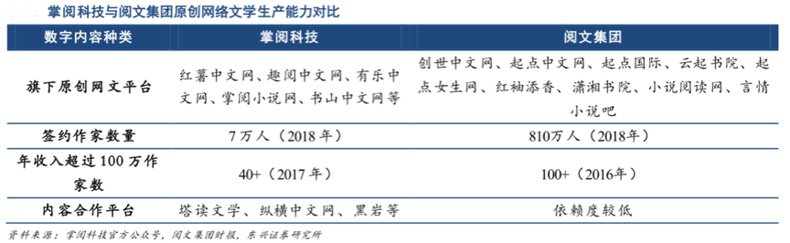 就數(shù)字閱讀電商新零售品牌策劃營(yíng)銷而言,系列且新穎的“內(nèi)容體系”是第一位的,基于高品質(zhì)內(nèi)容強(qiáng)化數(shù)字化內(nèi)容運(yùn)作機(jī)制搭建,依托于網(wǎng)絡(luò)內(nèi)容眾創(chuàng)、知名作家共建等搭建數(shù)字閱讀內(nèi)容平臺(tái),大勢(shì)所趨。根據(jù)掌閱科技官方公眾號(hào)、閱文集團(tuán)財(cái)報(bào)和東興證券研究所等綜合資訊表明,掌閱科技 2015 年正式成立“掌閱文學(xué)”后,合計(jì)簽約作家數(shù)超過 7 萬(2018 年)。以年收入超過 100 萬作家數(shù)指標(biāo)對(duì)比,掌閱科技數(shù)字內(nèi)容生產(chǎn)能力僅次于閱文集團(tuán),處于行業(yè)領(lǐng)先水平。