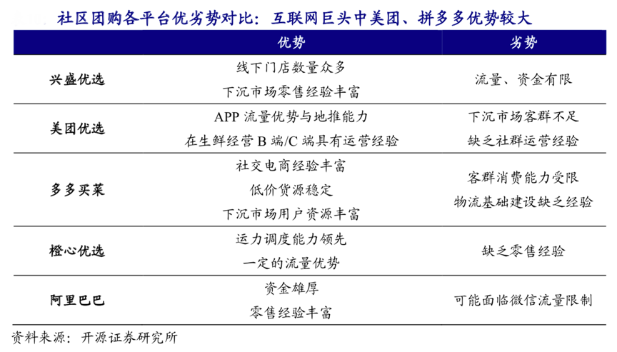 互聯網平臺,放大社區團購流量,刷新“社區新零售”認知。根據開源證券研究所等綜合資訊表明,社區團購各平臺優劣勢對比明顯,互聯網巨頭中美團、拼多多優勢力大,互聯網平臺普遍擁有較大的社區團購流量,“社區新零售”價值被再度翻新,社區營銷策劃是社區團購業務競爭的“主陣地”,“數字營銷策劃創新”是社區團購業務發展的“核心關鍵所在”,新零售模式策劃是產業級品牌策劃營銷的“價值創新指引”。