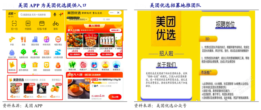 經典案例:根據美團APP、美團優選公眾號、開源證券研究所等綜合資訊表明,美團布局社區團購賽道,美團于2020 年 7 月成立優選事業部,目前團隊成員已發展到 3000 人,其中地推人員超過 1000 人。1)“美團優選入口”置于美團 APP 顯要位置,對接 4.5 億年活躍用戶流量,并設置“新人特權”實現低成本獲客,平臺原有餐飲和到家用戶也可以直接獲得部分轉化。2)美團坐擁“地推鐵軍”,外賣和到店時期積累的豐富地推經驗和業務拓展能力可以完美復制。