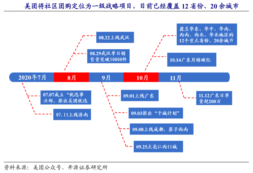 經典案例:根據美團公眾號、開源證券研究所等綜合資訊表明,2020 年 9 月,美團優選宣布推出“千城計劃”,旨在年 底前實現全國覆蓋,并逐步下沉至縣級市場。截至2020年10月份,美團優選已覆蓋華東、 華中、華南、西南、西北、華北等地區的 12 個重點省份、20 余城市。