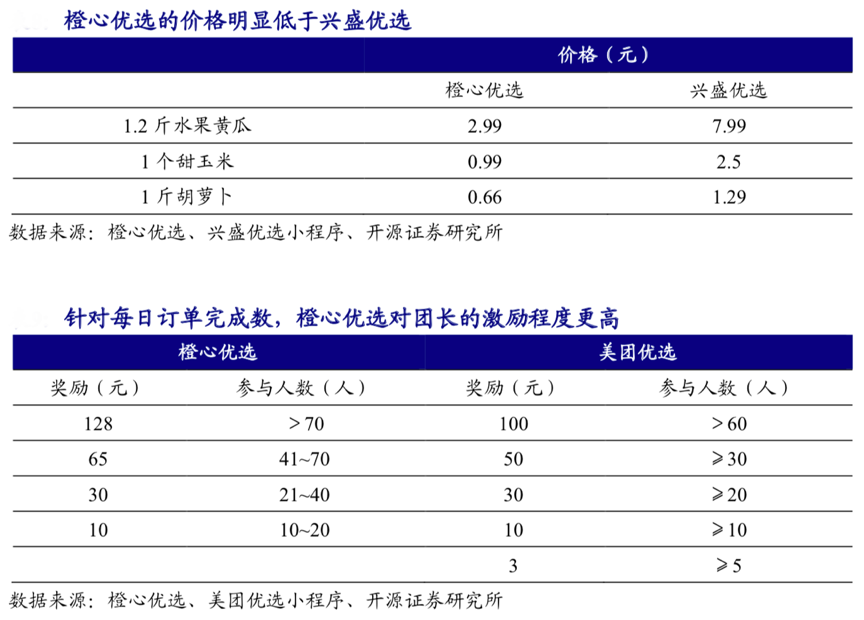 經典案例:根據橙心優選、興盛優選小程序、開源證券研究所等綜合資訊表明,為了快速起量,橙心優選采用了高額補貼打法:在產品上,對比興盛優選,橙心優選設計補貼的品類更多,且成本完全由平臺承擔,同時相同品類的價格橙心優選也低于興盛優選。在團長端,針對團長每日完成訂單數量,橙心優選給予的激勵也更大。