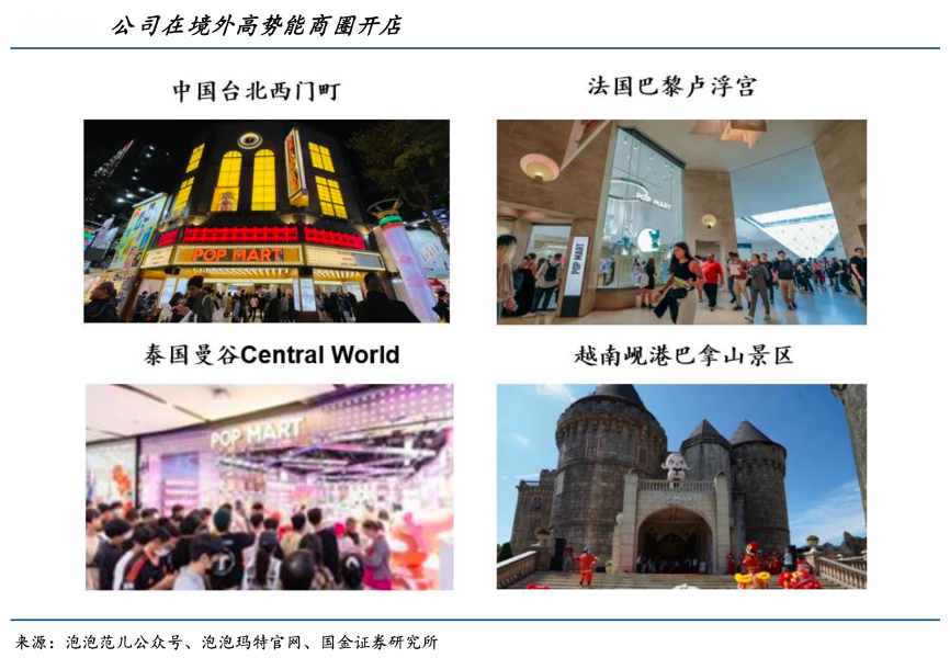經(jīng)典案例:根據(jù)泡泡瑪特官網(wǎng)、泡泡范兒公眾號(hào)、國(guó)金證券研究所等綜合資訊表明,2023 年 5 月泡泡瑪特海外首家古堡主題店巴拿山樂(lè)園古堡主題店在越南峴港盛大開(kāi)業(yè),位于目前越南客流量最大的主題公園;2024年品牌勢(shì)能 躍遷,向歐洲拓展 7 月泡泡瑪特盧浮宮店在 CARROUSEL DU LOUVRE 正式開(kāi)業(yè),距離博物館 次入口和倒玻璃金字塔僅僅幾步之遙,成為首個(gè)成功進(jìn)駐盧浮宮的中國(guó)潮玩品牌。