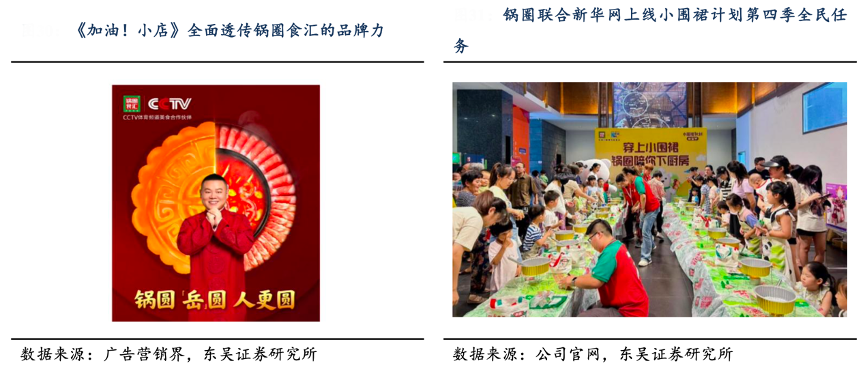 經(jīng)典案例:根據(jù)廣告營(yíng)銷界、公司官網(wǎng)、東吳證券研究所等綜合資訊表明,鍋圈公司通過(guò)代言人、官方渠道和綜藝節(jié)目植入廣告等持續(xù)深化品牌在消費(fèi)者群體中的心智認(rèn)知,2022年公司精準(zhǔn)鎖定《加油!小店》和《暖暖的火鍋》兩檔衛(wèi)視熱門綜藝,以此建立年輕大眾化溝通陣地;2024 年 7 月公司聯(lián) 合新華網(wǎng)上線暑期檔全民任務(wù)——小圍裙計(jì)劃第四季。