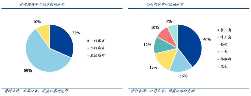 經典案例:根據公司公告、國盛證券研究所等綜合資訊表明,從城市能級分布來看,華潤在營購物中心主要布局于全國一二線城市,截止 2024 年底項目數量占比分別達 32%和 59%,這類城市經濟活力更強,消費潛力較大,購物中心租金增長和資產升值空間較高。