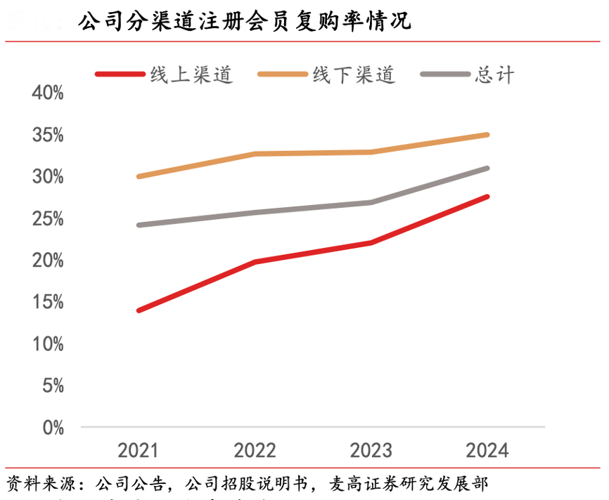 經典案例:根據公司公告、公司招股說明書、麥高證券研究發展部等綜合資訊表明,毛戈平公司用戶忠誠度多年來持續提升,2024 年線下渠道和線上渠道會員復購率分別為 34.9%和 27.5%,線下渠道憑借體驗優勢復購率較線上渠道高出 7.4pct。